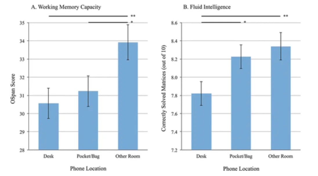 Another study from the University of Texas showed that even the presence of a smartphone nearby reduces working memory and fluid intelligence — your brainpower is split, even if you don’t touch it (Ward et al., 2017).